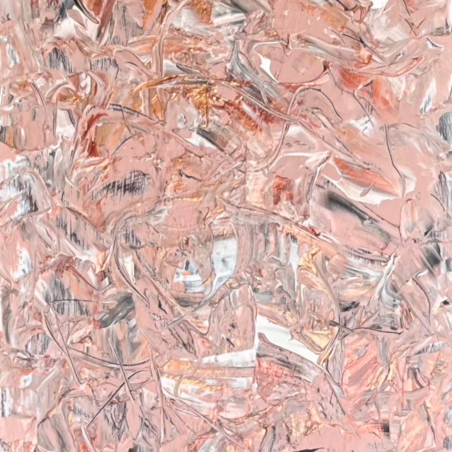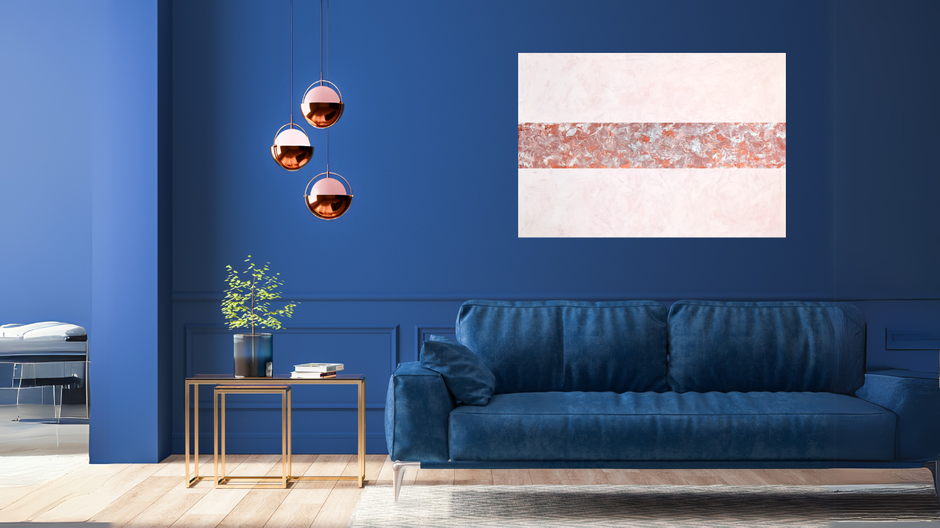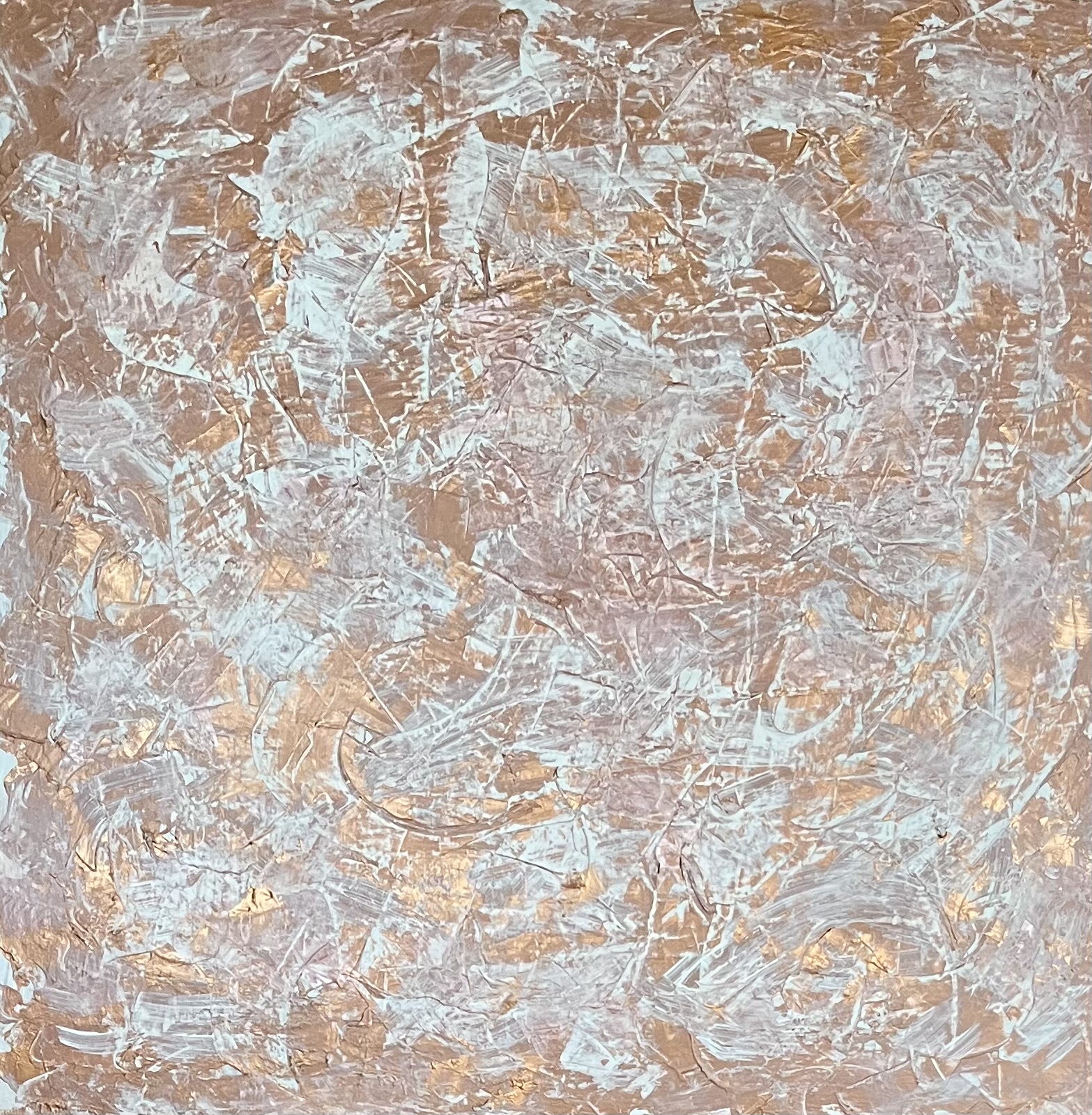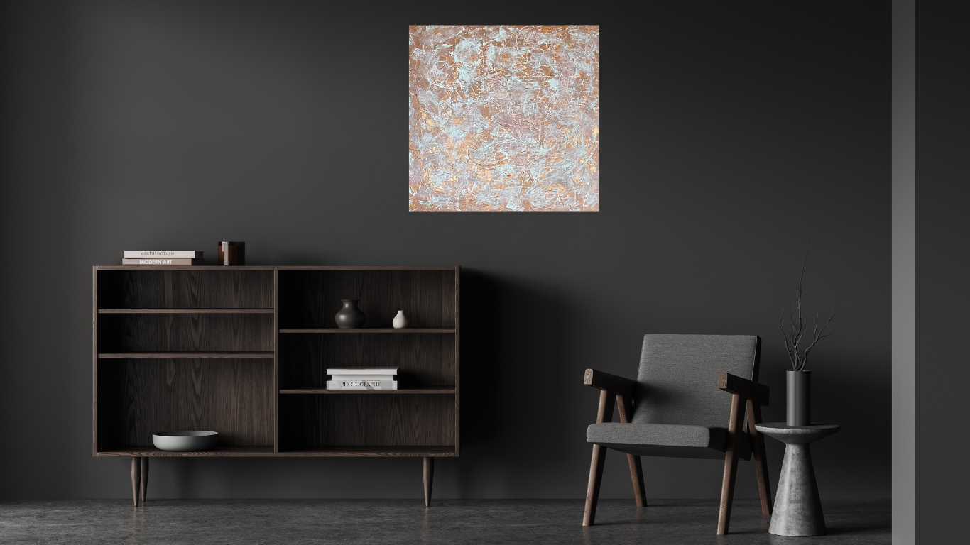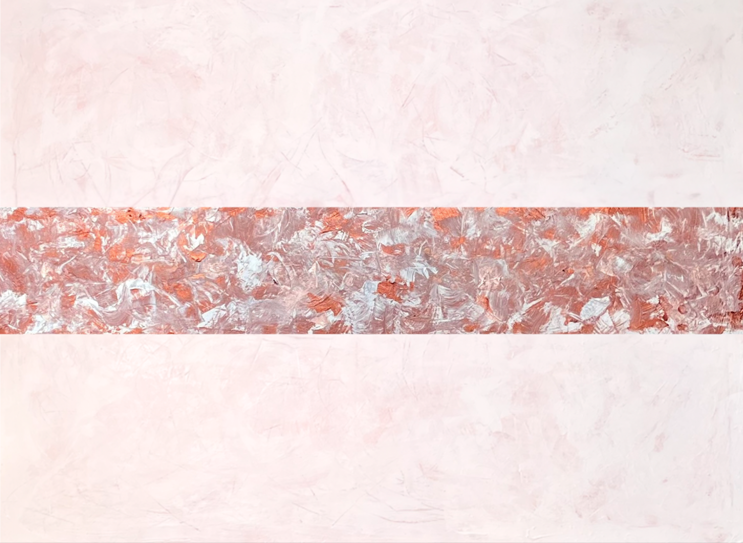 Le cuivre métallisé se mêle aux touches de blanc et de cuivre rosé apportant chaleur et profondeur au bandeau central qui domine la toile.