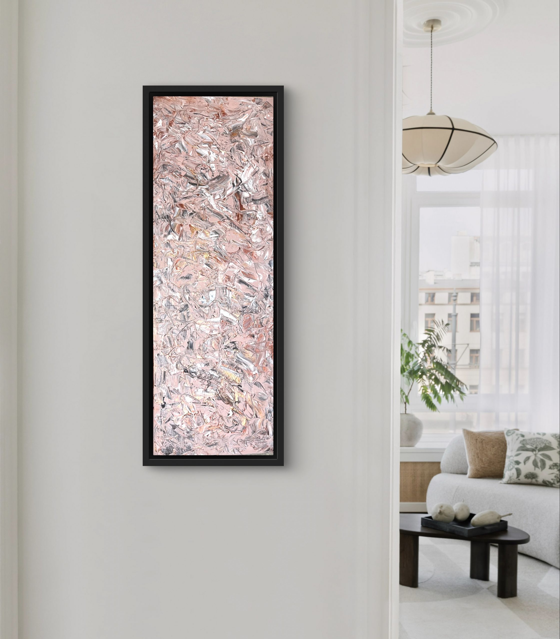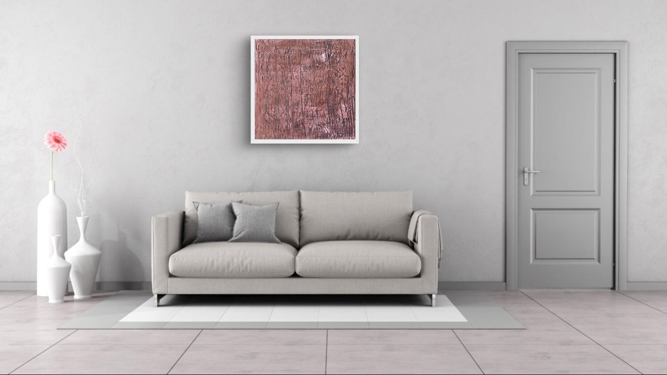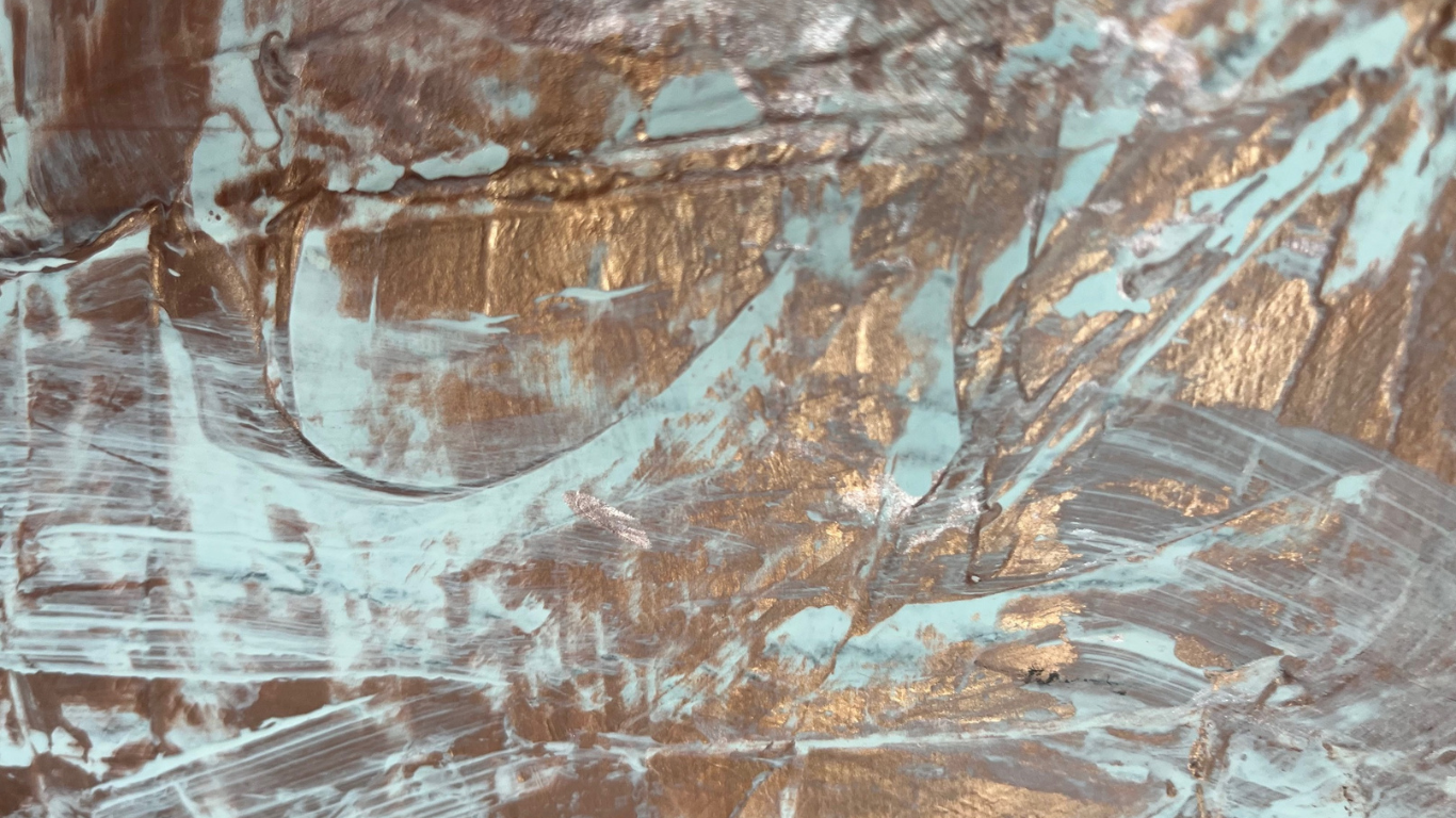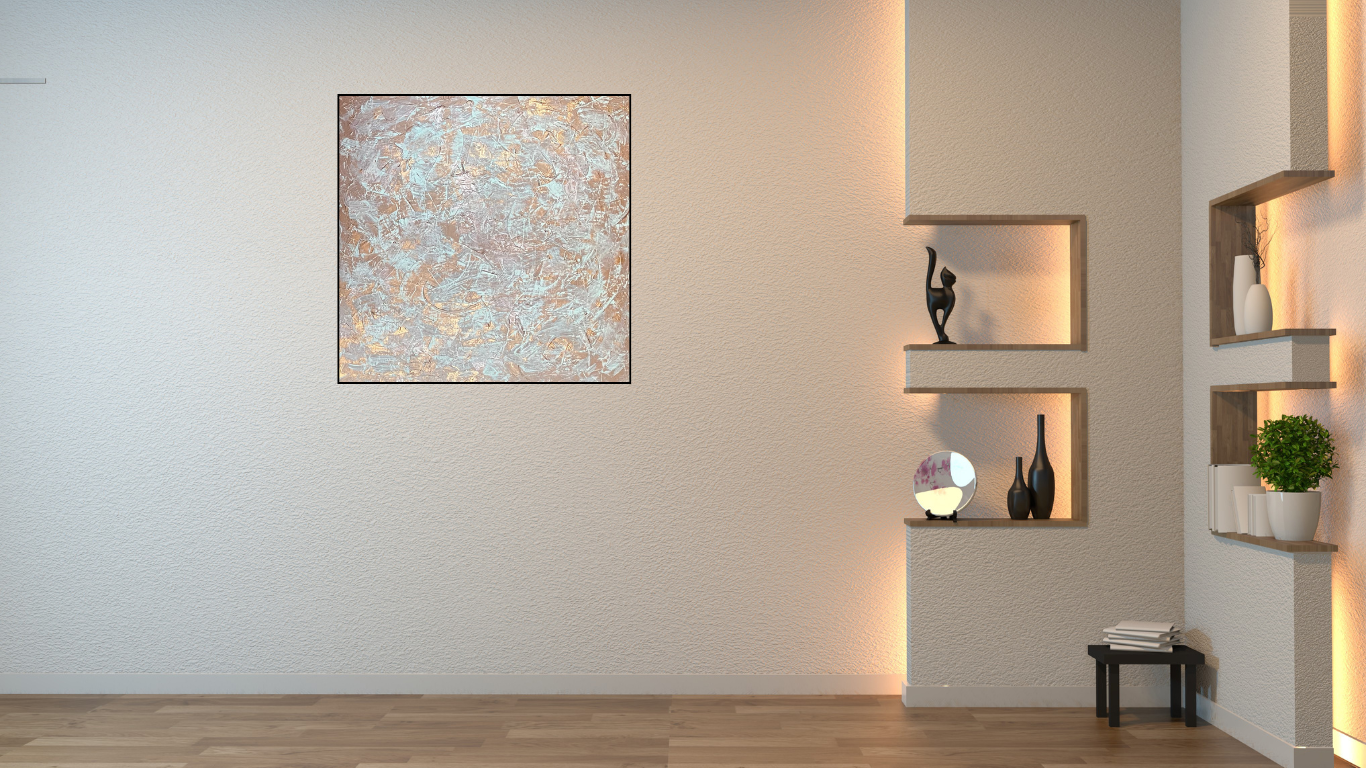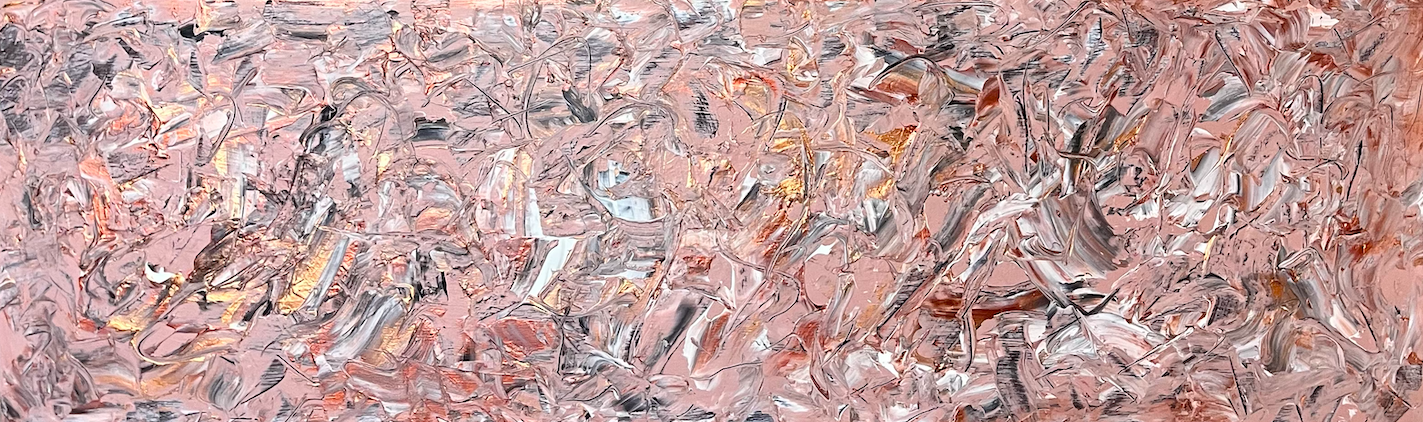 Le cuivre métallisé se mêle aux touches de blanc et de cuivre rosé apportant chaleur et profondeur au bandeau central qui domine la toile.