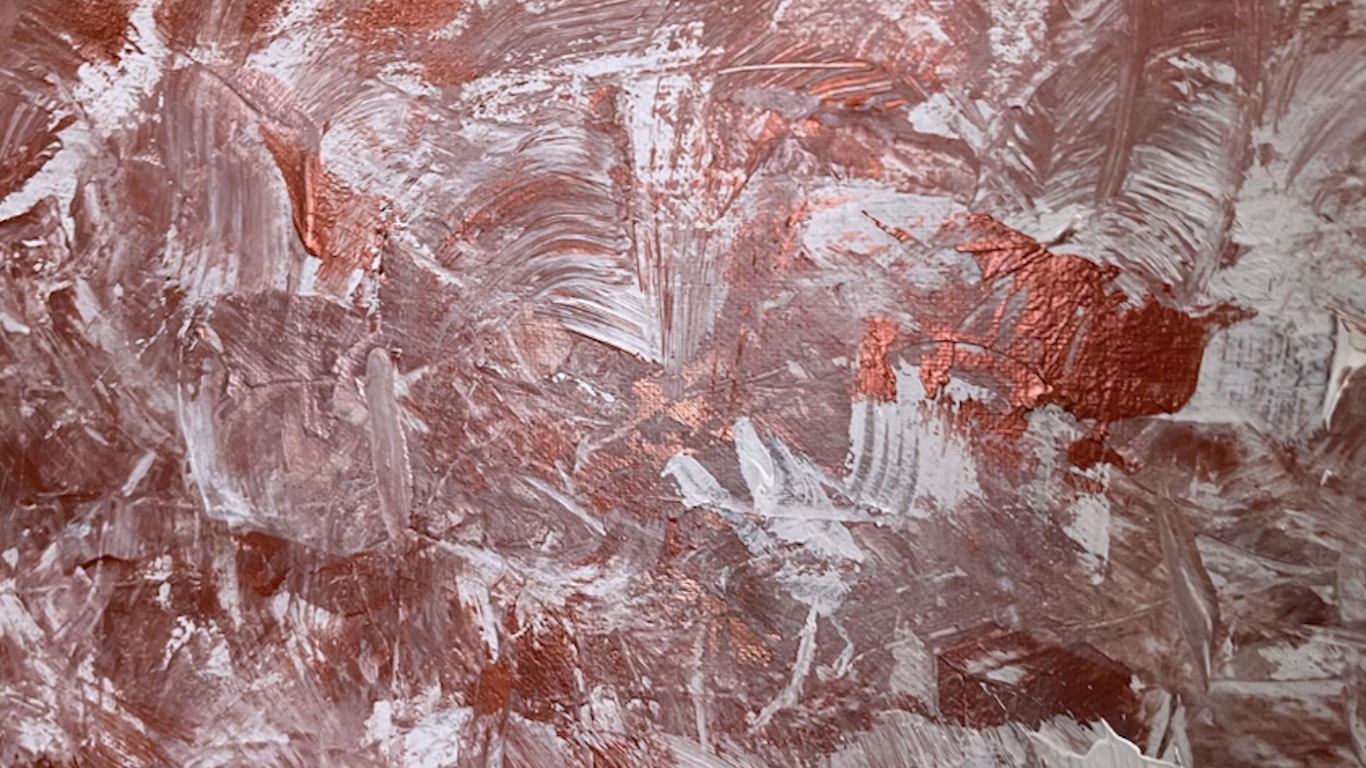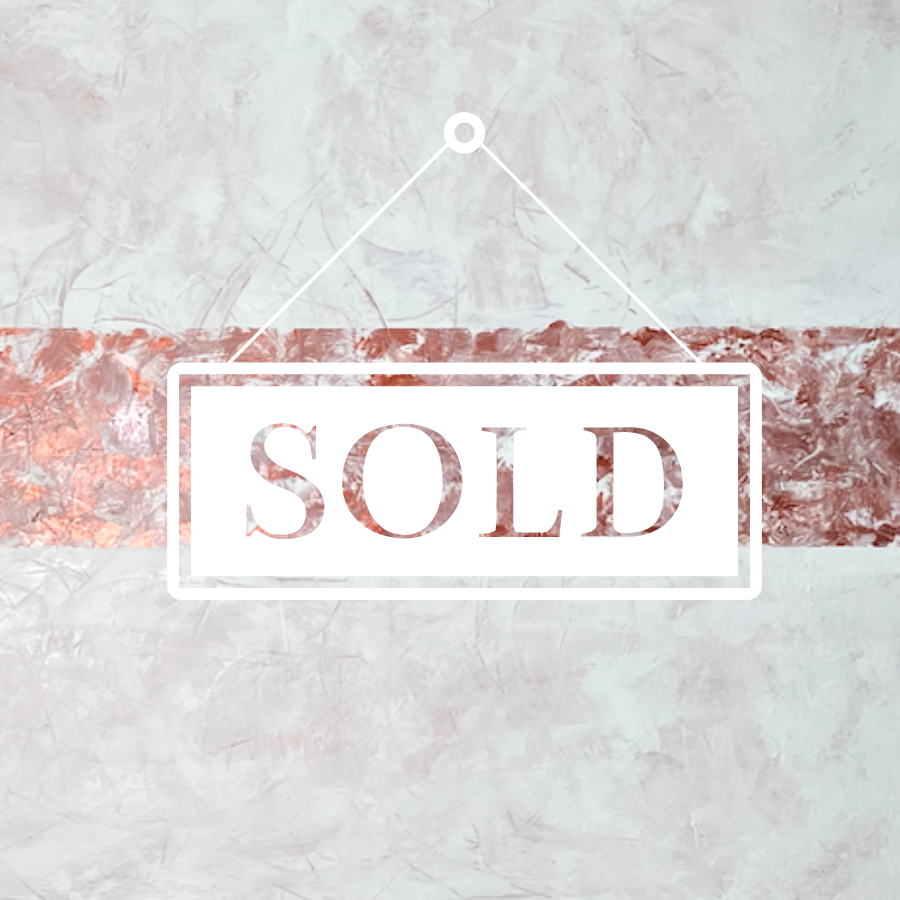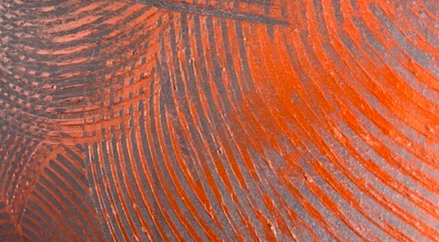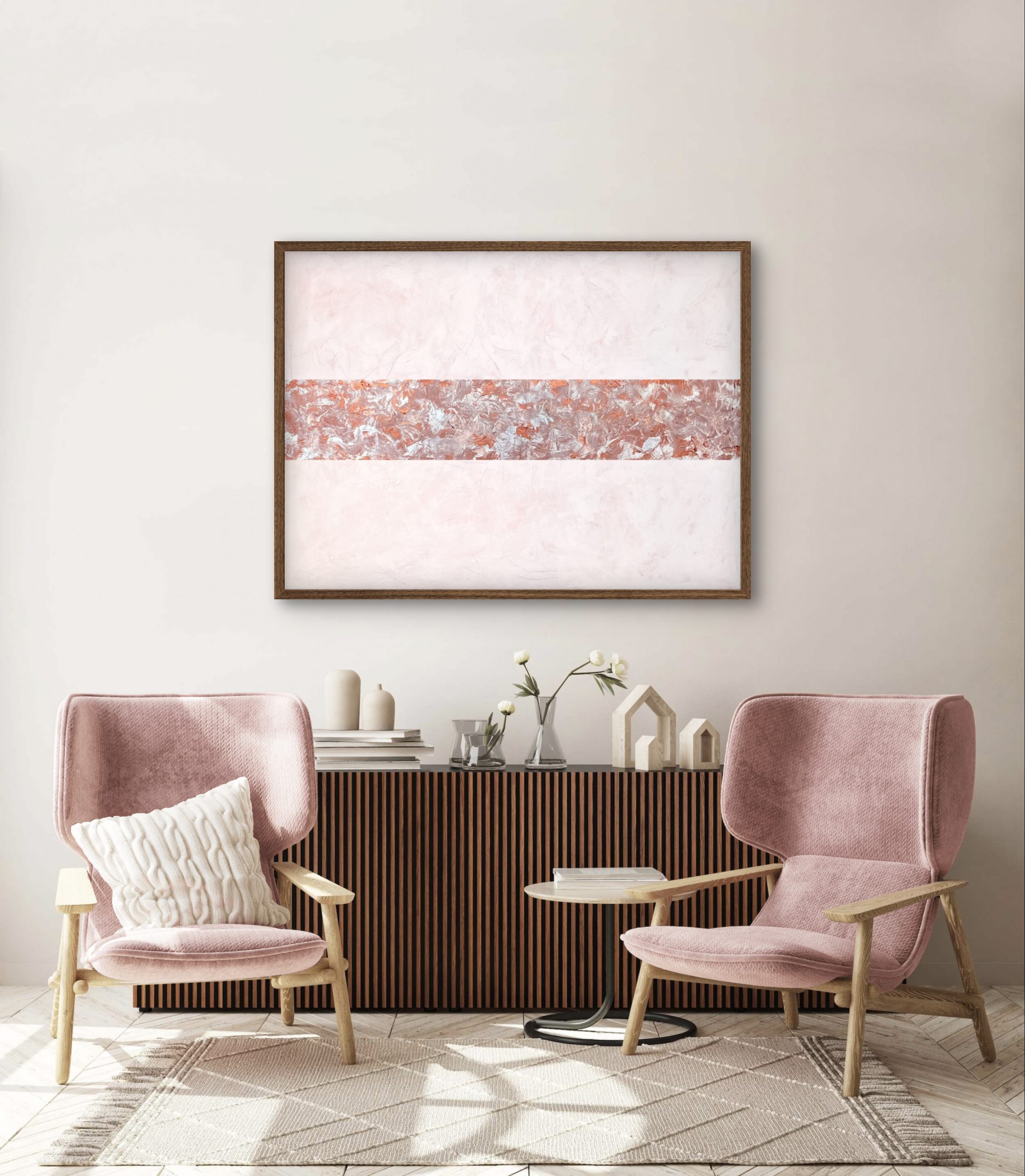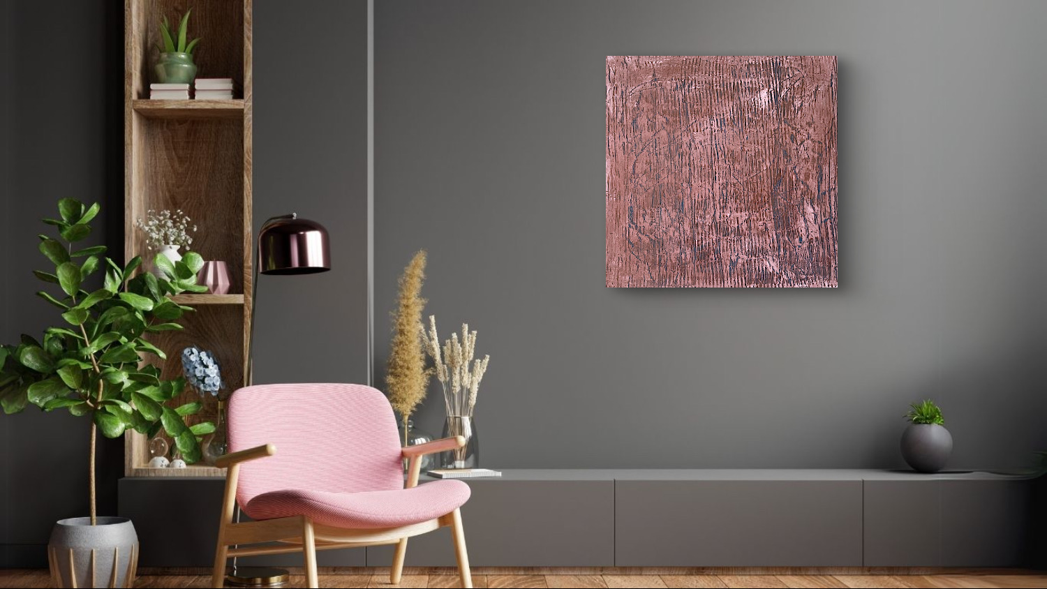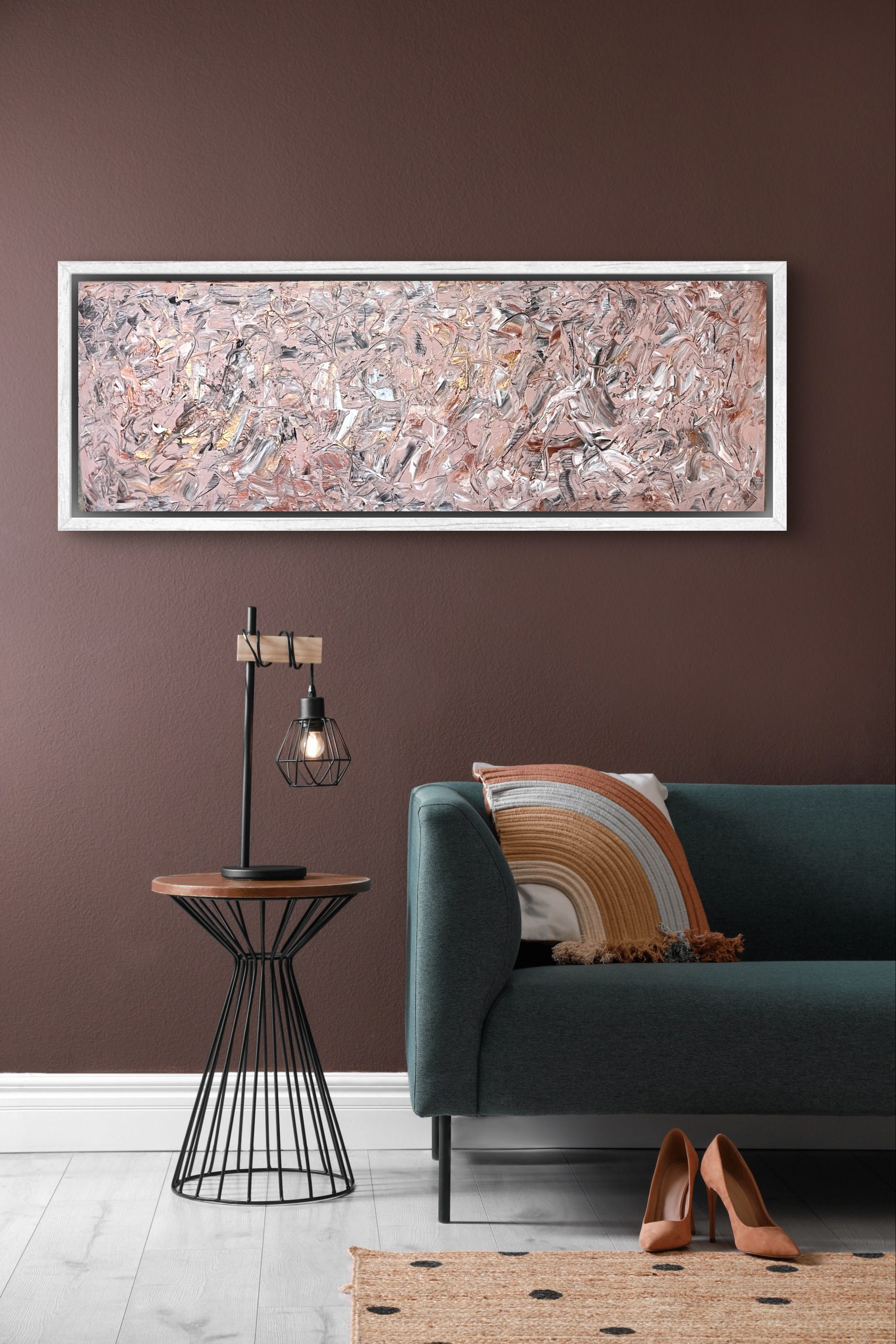 Le cuivre métallisé se mêle aux touches de blanc et de cuivre rosé apportant chaleur et profondeur au bandeau central qui domine la toile.