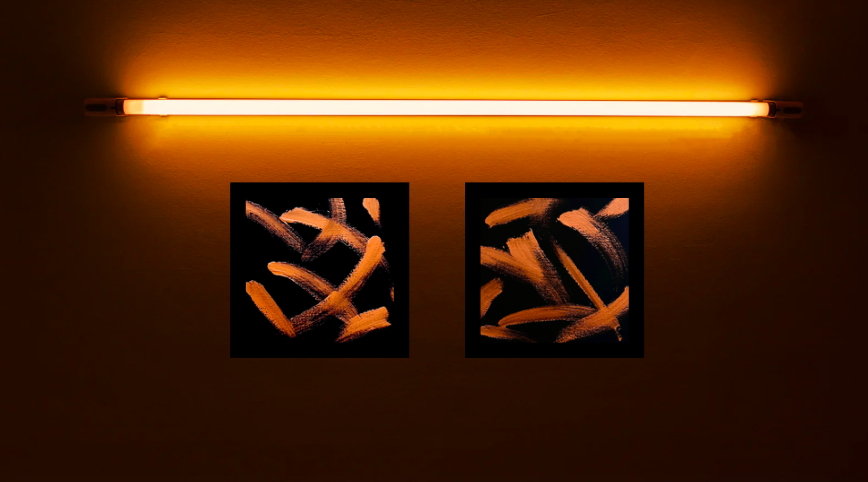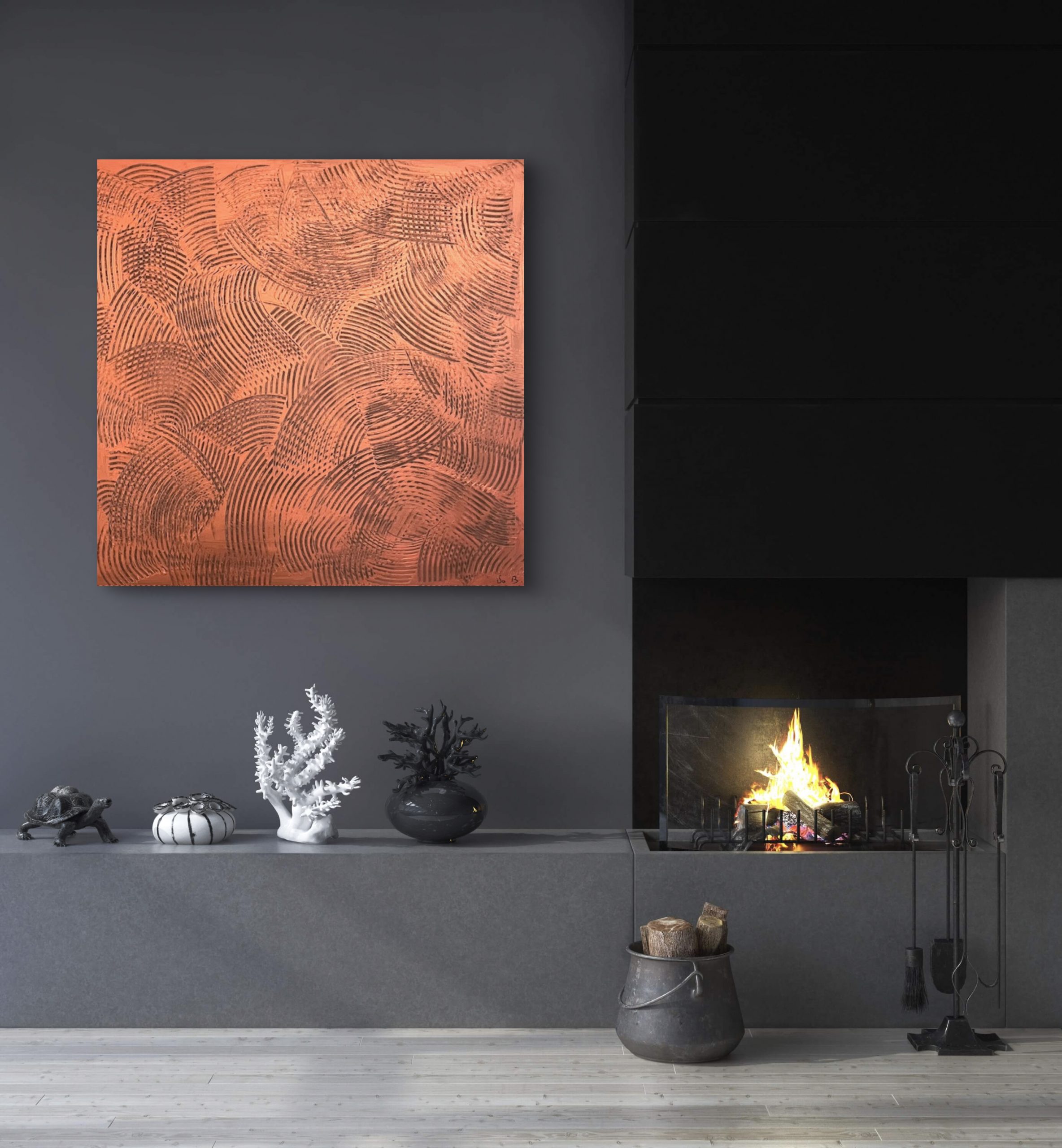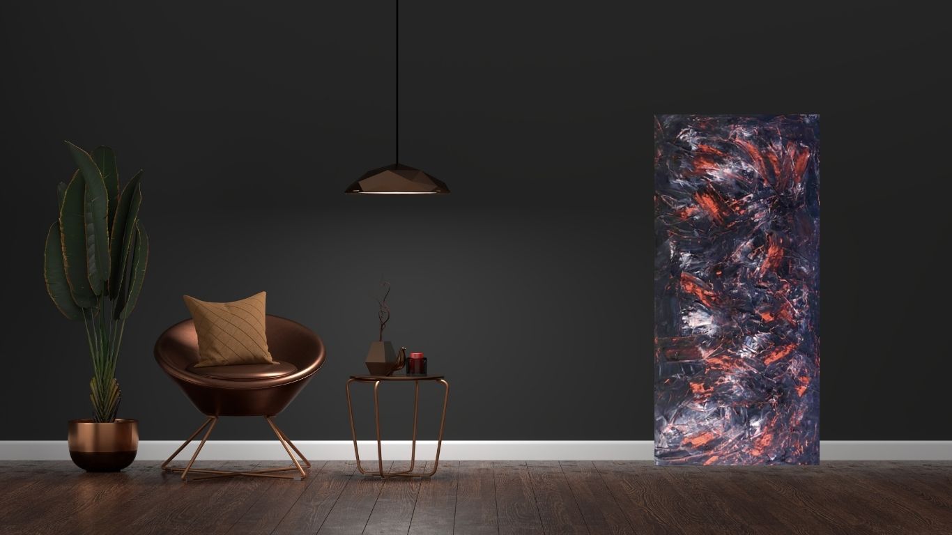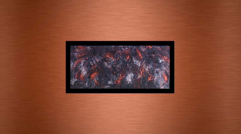 Les reflets du cuivre chaud jaillissent de l’obscurité imposant leur présence et illuminant la toile.