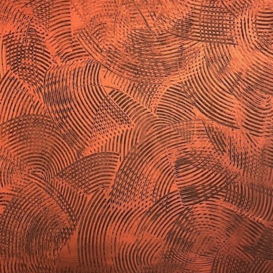 D’élégantes arabesques douces, mielleuses captivent ici le regard, les reflets chauds cuivrés illuminant généreusement les courbes tracées délicatement sur la toile.